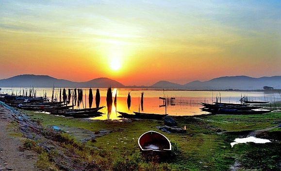 Chilika Lake is a brackish water lagoon, covering an area of over 1100 sq.km (425 sq.mi). It is the largest coastal lagoon in India. A total 42 sq.km (16 sq.mi) of channels connect the lake with the Bay of Bengal. The lake has numerous islands. There are 132 villages on the shore and islands. The lake is an ecosystem, hosting over 160 species of birds in the migratory season, 726 species of flowering plants and rare and threatened animal species such as green sea turtle, dugong, irrawadyy dolphin, blackbuck, spoon billed sandpiper, fishing cat, etc.