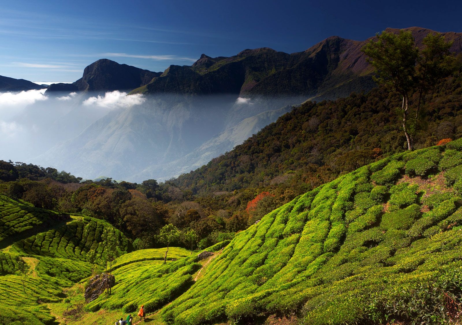 Munnar is a hill station and a former British summer resort located at an altitude of 1600 m (5249 ft) in the Western Ghats. The town is situated at the confluence of the Muthirappuzha, Chadavurai and Kundaly Rivers and is surrounded by tea plantations. Munnar is a popular place for trekking. Close to Munnar is Punarjani Traditional Village showcasing kathakali and kalarippayattu classical Kerala dance and Indiian martial art performances.